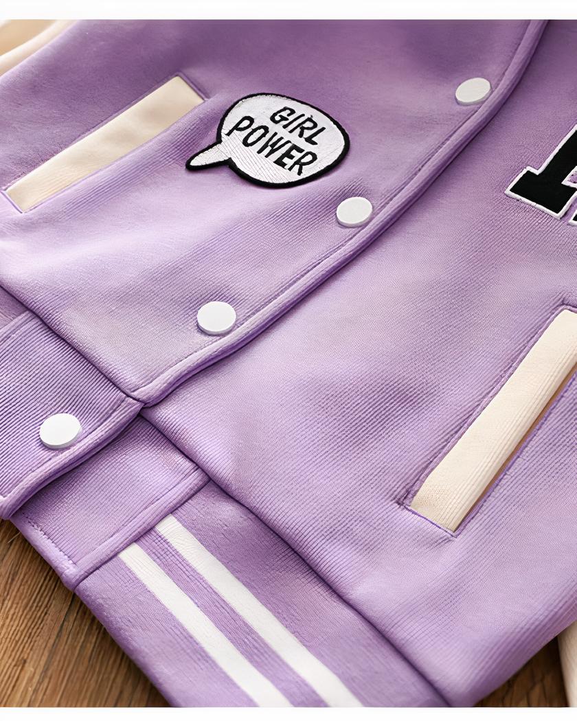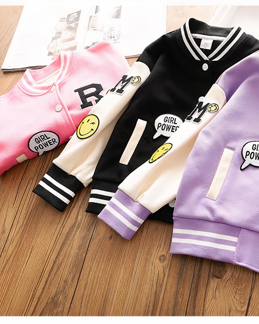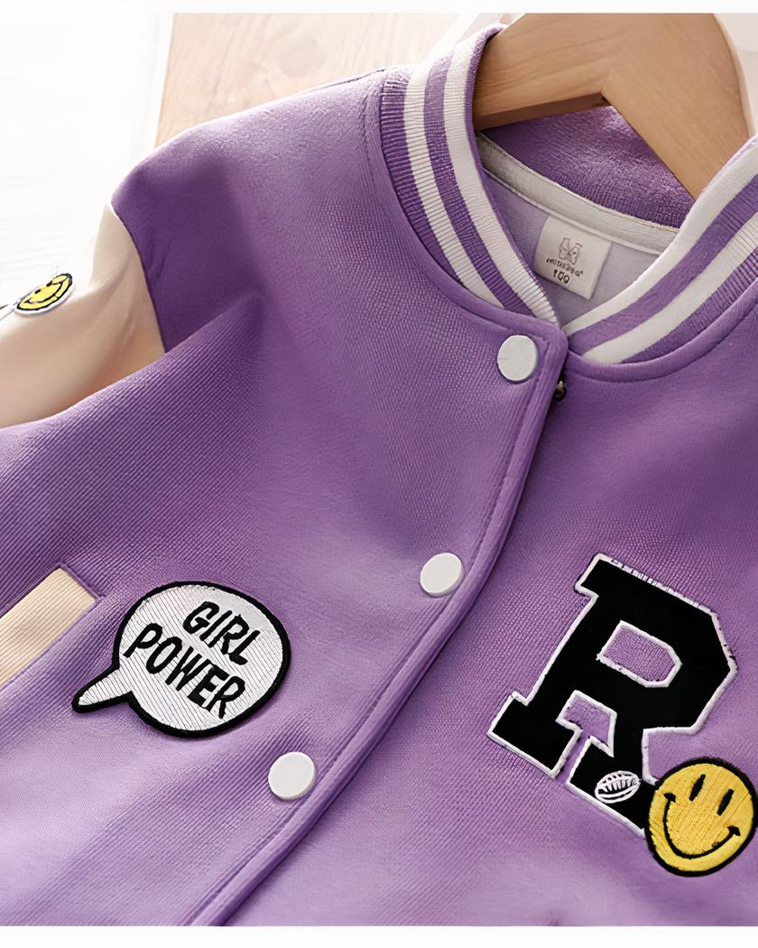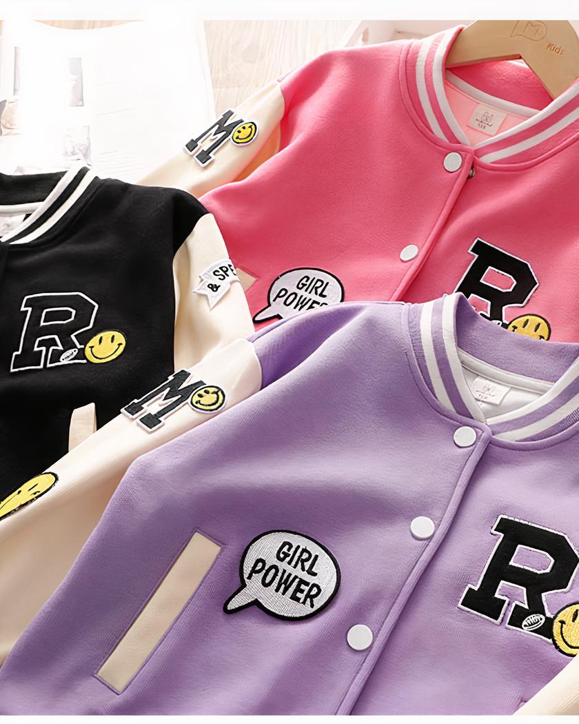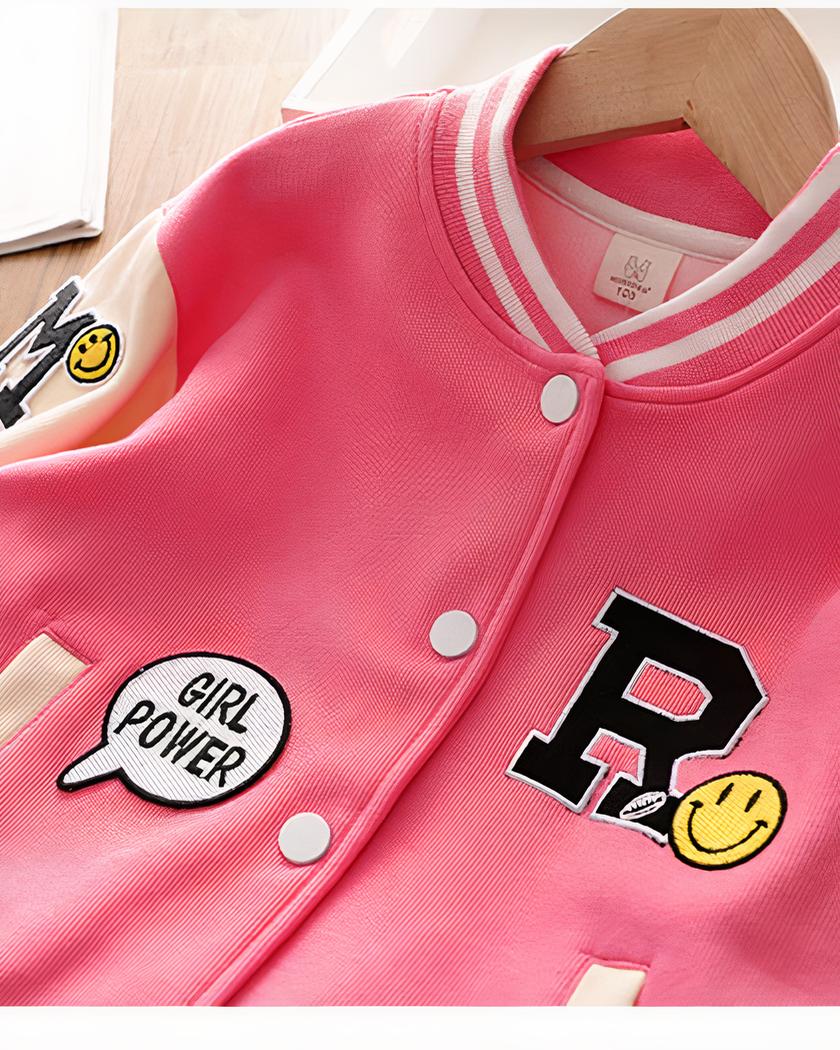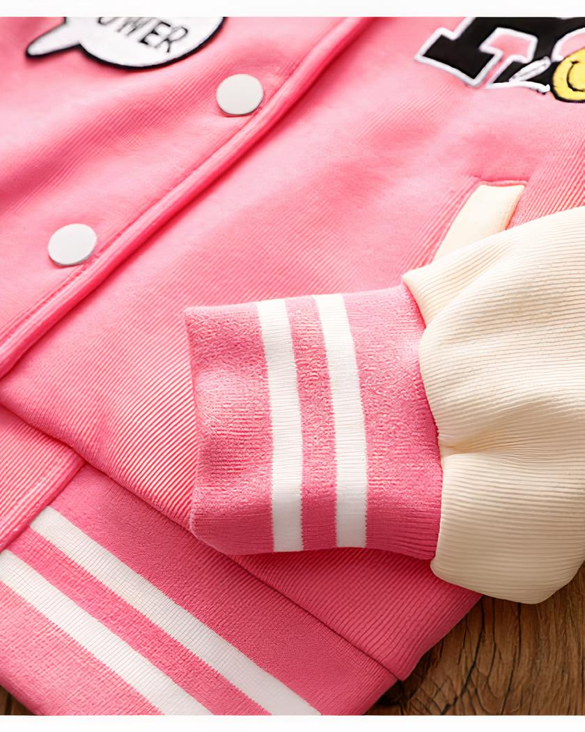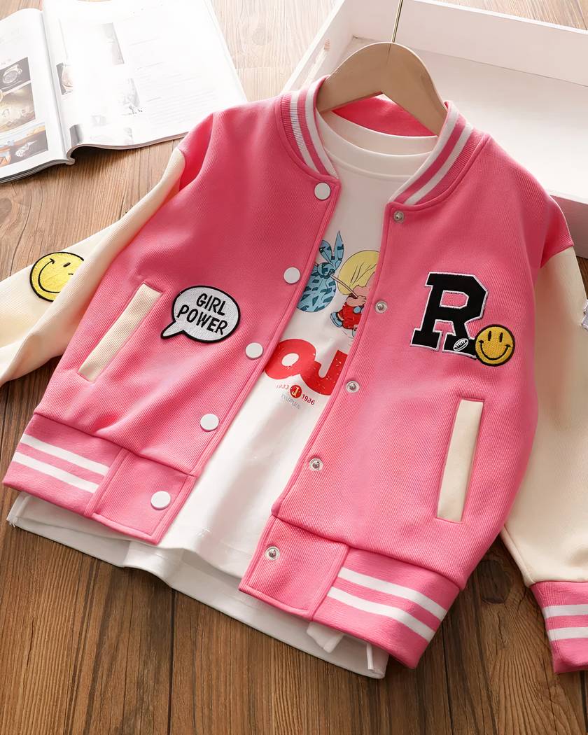 Ce blouson teddy pour fille est un vêtement au design inspiré du style américain et de leurs supportrices de baseball, avec de jolis motifs qui apportent une touche de modernité et de fantaisie.