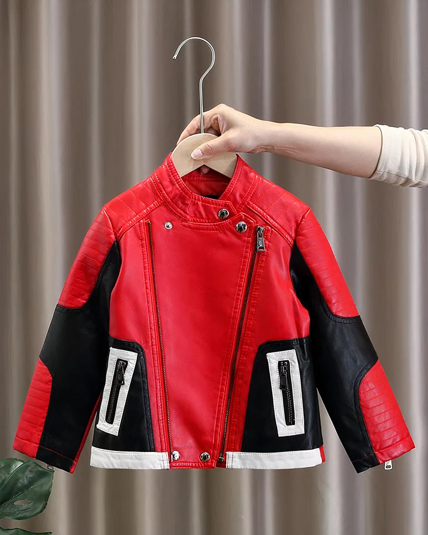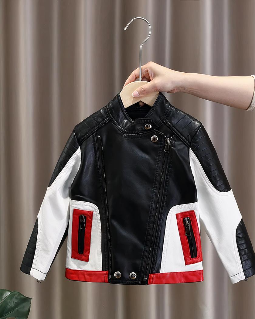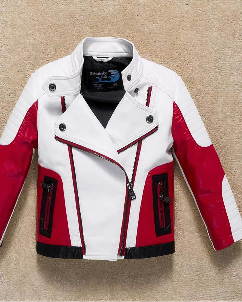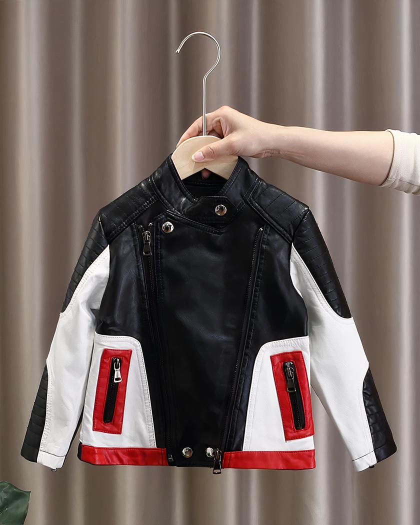 Le noir reste la couleur intemporelle des motards, le blanc donne un effet chic et le rouge donne de la visibilité à ce blouson en simili cuir. Votre enfant pourra porter avec fierté ce blouson de motard.