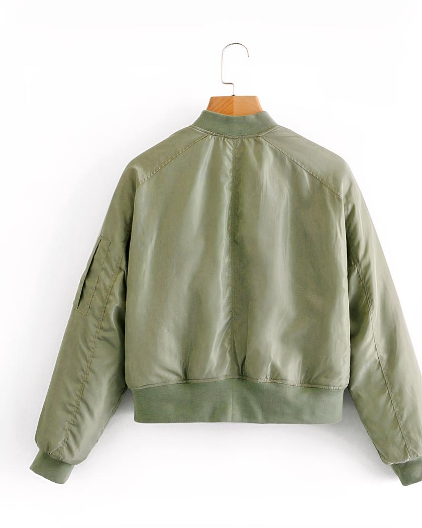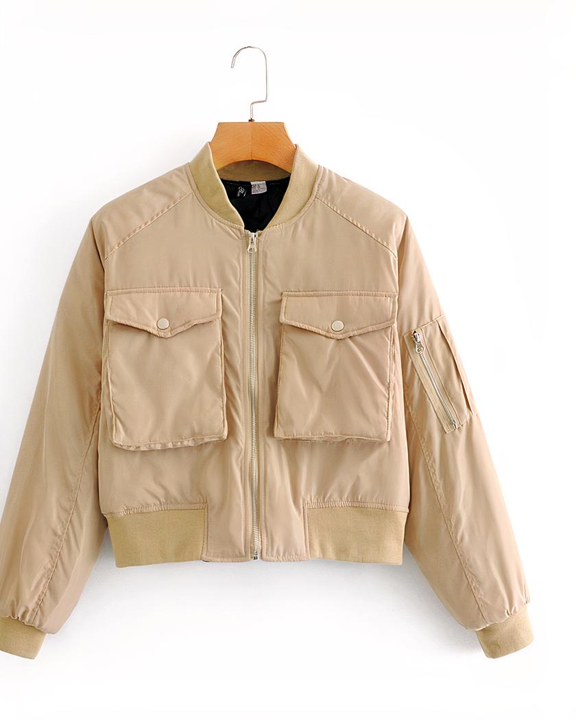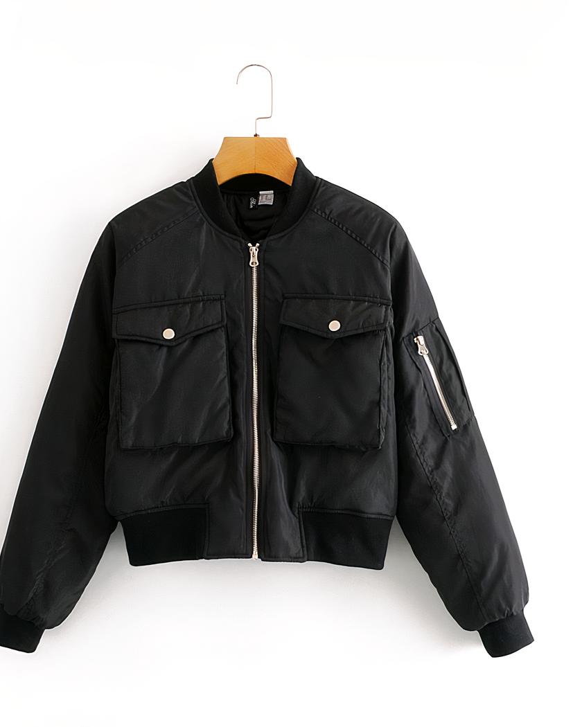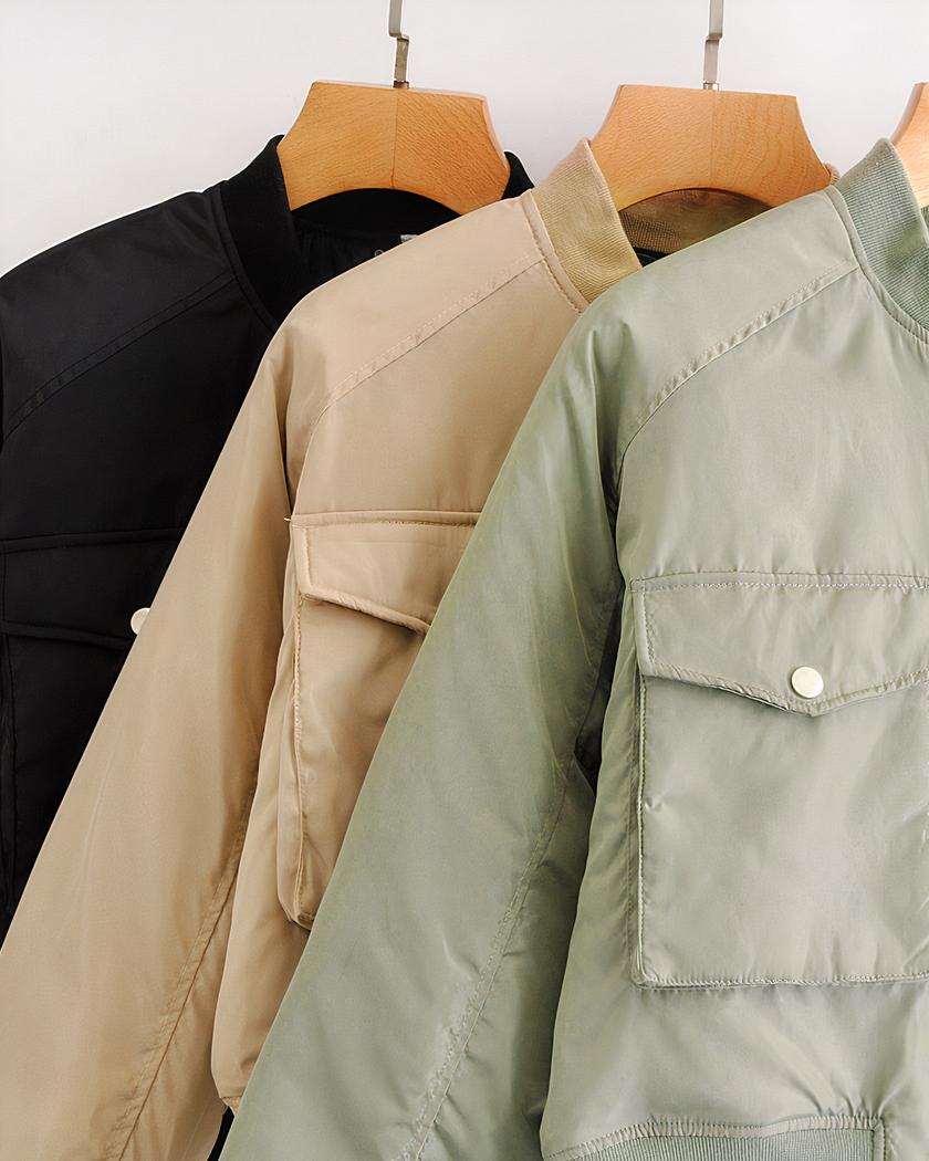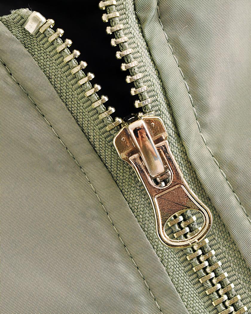 En termes de fonctionnalité, ce blouson ne manque pas d’options pratiques. Il possède deux grandes poches sur la poitrine, refermables à l’aide de boutons-pression. Le col légèrement montant est la signature du style bomber.
