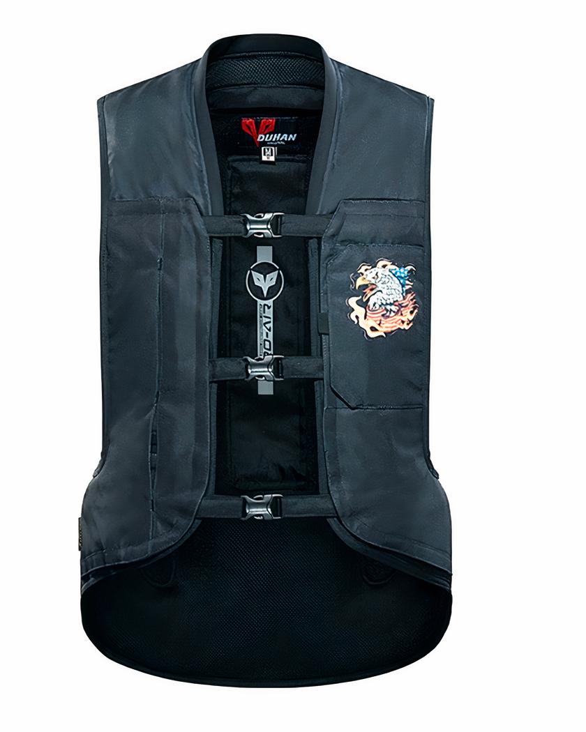 Passionnés de deux-roues, laissez-vous séduire par l’esthétique remarquable et le confort incomparable de notre blouson airbag moto. Avec ses finitions rebelles et rock’n’roll, ce vêtement allie parfaitement sécurité et style. Son design inspiré de l’esprit américain, avec son dessin d’aigle entouré de flammes, vous assure une allure unique sur la route.